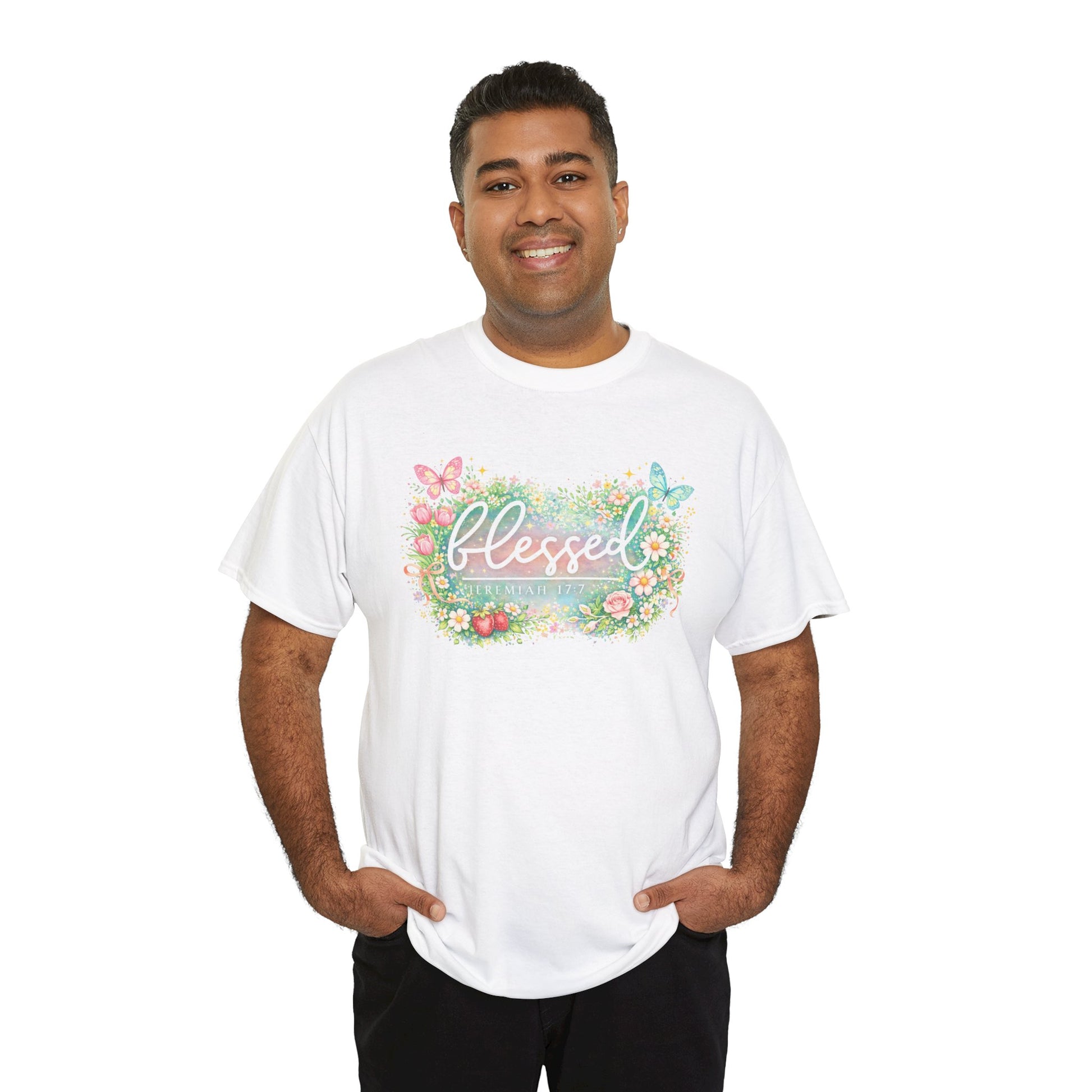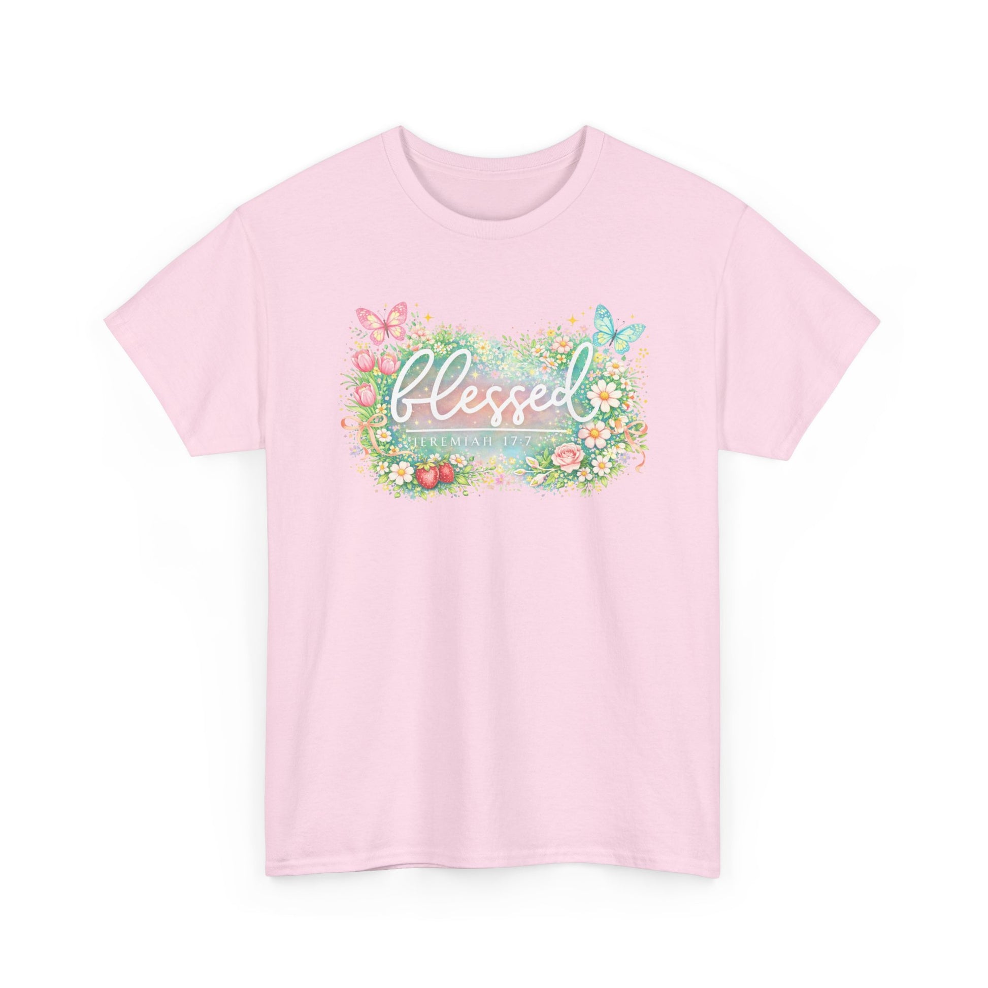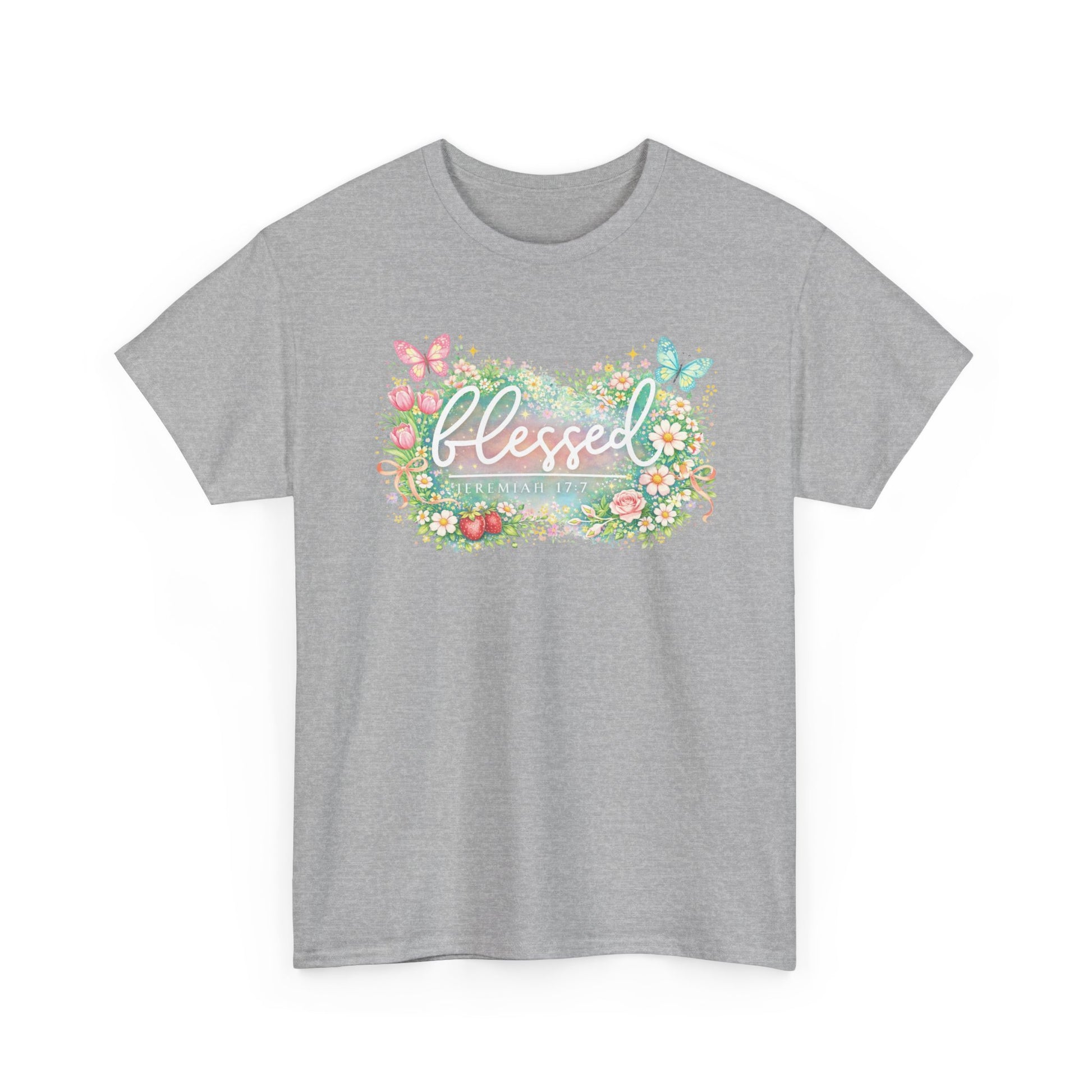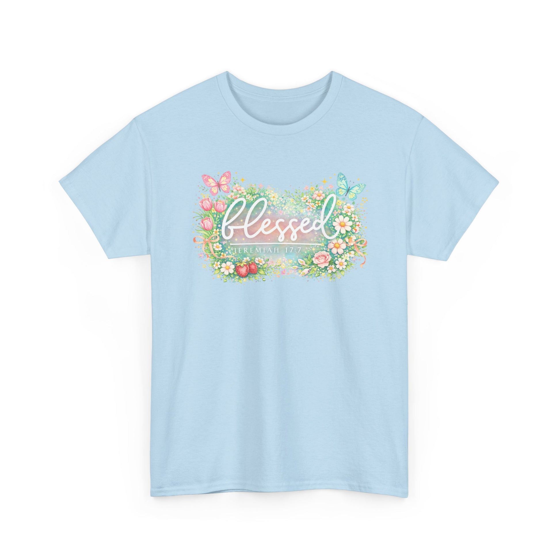 Soft, airy, and quietly joyful — this classic tee carries a gentle reminder of gratitude. A watercolor-style wreath of wildflowers and butterflies frames the hand-lettered word “blessed,” rendered in soft pastels that feel like a warm morning. The relaxed crew silhouette layers easily over jeans, skirts, or a cardigan, and the breathable cotton keeps the print vivid without feeling stiff. Wear it during slow Sundays, community gatherings, or whenever you want to bring a calm, thankful moment into your day.